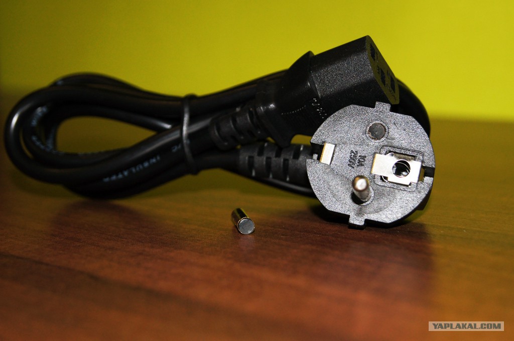 На днях на работе купили компьютер в корпусе InWin. В комплекте оказался провод со сломанной вилкой. Я много видел, но только не вилку с пластмассовыми контактами, покрытыми фольгой.