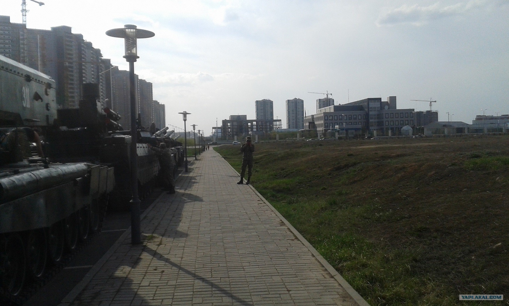В Астане идет подготовка к параду. Техника выстроена и проходит смотр в сотне метров от американского посольства. Стволы невзначай смотрят в сторону посольства.